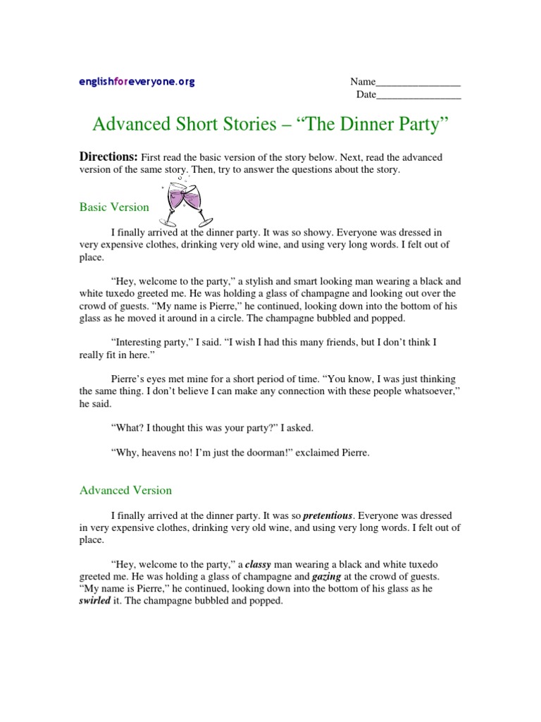 250 Best Would You Rather Questions For A Good Game Night from parade.com tiny each of the following questions tests your understanding of story elements. (may answer as many as apply) In our home the most enjoyable dinner party stories are personal accounts and are often humorous. Short stories, dinner party email this topic • print this page. Everyone was dressed in very expensive clothes, drinking very old wine, and using very long words. A colonial official and his wife are giving a large dinner party. Take into account the context of the situation. What are two major differences between the play and the short story?